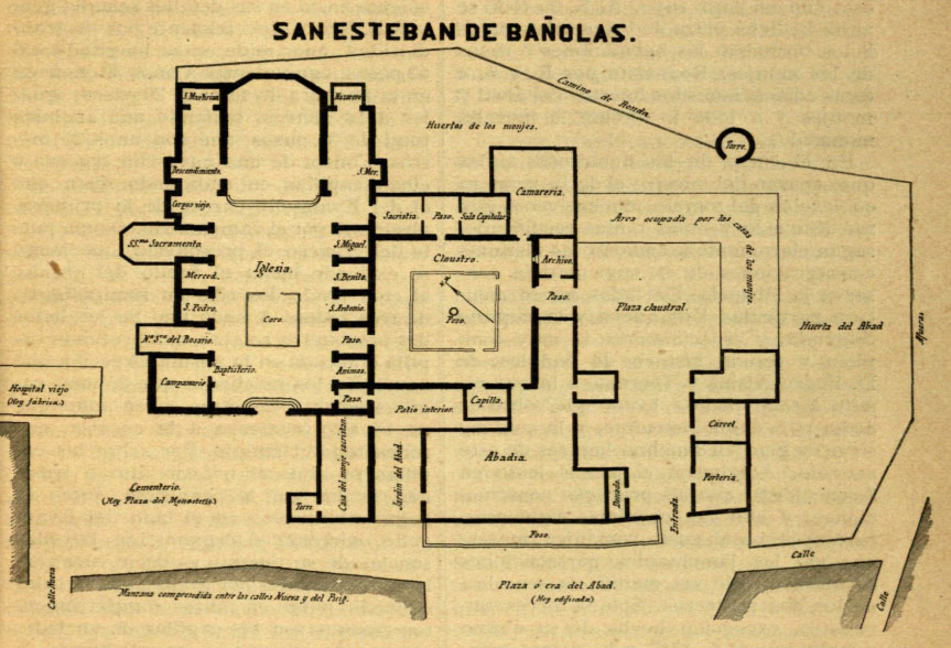 Plànol del monestir de Sant Esteve. "Las casas de religiosos en Cataluña durant el primer tercio del siglo XIX", Gaietà Barraquer i Roviralta. 1906. UAB. - (Ampliar)