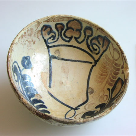 Bol de ceràmica catalana vidriada en blau i reflexos daurats marrons del segle XV. 13,5 cm de diàmetre d’obertura i 5,5 cm d'altura. Procedent de Cal Moliner. Museu Arqueològic de Banyoles. - (Ampliar)