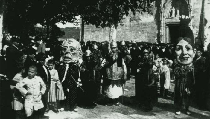 Cavallets i capgrossos davant del Monestir de Sant Esteve, a principi del segle XX. Els cavallets actuaven durant l’entrada de l’Abat. Autor desconegut. Arxiu Municipal de Banyoles. Fons d’Imatges del Pla de l’Estany. - (Ampliar)