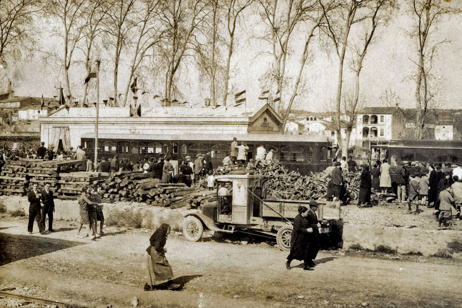Arribada del primer tren de passatgers el dia de la inauguració de l'estació de Banyoles. 15 de març a de 1928. Autor desconegut. Arxiu Comarcal del Pla de l’Estany. - (Ampliar)