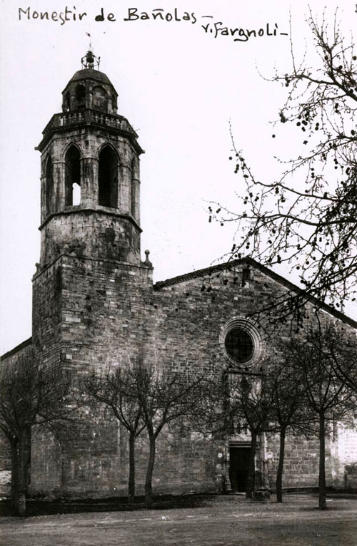 Monestir de Sant Esteve de Banyoles. Vista de la façana i del campanar. 1911-1936. Valentí Fargnoli. CRDI - Ajuntament de Girona. - (Ampliar)
