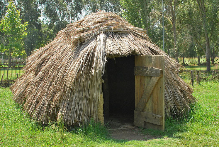 Cabana reconstruïda mitjançant mètodes d'arqueologia experimental al parc neolític de la Draga. Daniel Zapater. Viquipèdia. - (Ampliar)