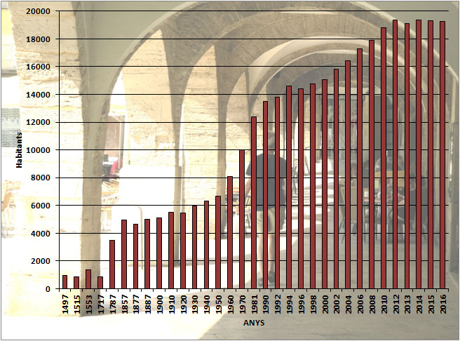 Evolució demogràfica de Banyoles. Les dades dels anys 1497-1553 s'han estimat en base als focs: 1497, 172 focs; 1515, 154 focs; 1553, 245 focs. Les dades del període 1717-1981, corresponen a població de fet; a partir de 1990, població de dret. Dades recents extretes d'Idescat. - (Ampliar)