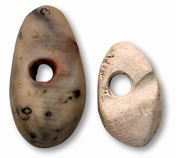Denes-penjoll. Valves d’ostra vermella i d’escopinya. Més gran: 1,7 x 0,9 x 0,6 cm. Exposició "La Revolució neolítica". - (Ampliar)
