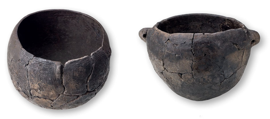 Atuells ceràmics de La Draga. Esquerra; Olla amb decoració cardial. Alçada 20 cm, diàmetre 20,2 cm. Dreta: Olla amb nanses per penjar-la. Alçada 20 cm, diàmetre 20,2 cm. Exposició "La Revolució neolítica", al MAC - Girona. - (Ampliar)