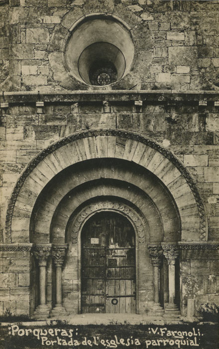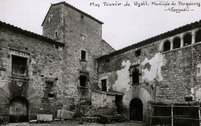 És citat en la documentació des del 957, tot i que segurament devia existir des del segle anterior, en què el lloc era ja repoblat, i amb una església dedicada a Santa Maria. La família senyora del castell consta des de l'any 957 amb Ademar I, castellé del castell de Finestres i senyor de Porqueres. Aquesta família, que és el tronc dels barons de Santa Pau, es començà a cognomenar Porqueres a partir del segle XI. La història d'aquest llinatge i les seves actuacions sobre el territori del castell són conegudes fins al 1251, any en què Ramon Ademar II de Porqueres i la seva esposa Gueraula, van vendre el castell a l'abat de Banyoles, Guillem de Cartellà. Els Porqueres fixaren la seva residència a Santa Pau i prengueren el cognom Santa Pau mentre que el castell de Porqueres passà a poder del monestir de Banyoles que va ampliar-ne els drets sobre el terme el 1324, any en què el rei Pere III va adquirir-ne, per 5.000 sous, la jurisdicció civil i criminal. ![]() Església de Santa Maria de Porqueres. 1940-1953. Rafael Vilarrubias Ros. INSPAI - Diputació de Girona. L'església parroquial de Santa Maria. És documentada el 906, data en què era possessió del monestir de Sant Joan de les Abadesses. Posteriorment va pertànyer al monestir de Sant Esteve de Banyoles, al qual és confirmada l’església de Santa Maria i Sant Llorenç de Porqueres per sengles butlles papals del 1097 i del 1174. L’edifici actual s’ha identificat amb l’església que es consagrà el 1182; és un edifici romànic d’una sola nau i un absis semicircular a l’exterior però trilobulat a l’interior. El portal, a la façana de ponent, és format per tres arcs de ferradura en degradació sobre unes columnes amb capitells esculpits amb temes vegetals i animals. Els capitells de l’arc triomfal tenen temes historiats, d’un gran interès iconogràfic i escultòric. L’església, que havia estat parcialment reformada al segle XVIII, va ser restaurada el 1957, retornant-li la seva estructura originària. ![]() Mas Traver d'Usall. Vista de la façana on es pot observar un rellotge de Sol. 1911. Valentí Fargnoli i Annetta. CRDI - Ajuntament de Girona - (Ampliar) Usall. Documentat com Usall (1017) i Usalio (1086), el poble és situat al pla d’Usall, al nord de l’Estany de Banyoles i a ponent de l’Estany d’Espolla. L’església parroquial de Sant Cristòfol, saquejada el 1653, durant la Guerra dels Segadors per tropes franceses, és romànica, amb una sola nau i campanar d’espadanya del segle XI. Conserva una imatge d’un gran valor artístic. El lloc era possessió del monestir de Banyoles. Entre les masies del seu terme destaca Can Traver, que es remunta al segle XIII, una construcció en forma de L que tanca un pati molt gran del segle XVII. Hi ha les fonts intermitents de Cutzac i d’Espolla, estany que apareix només després d’una temporada de pluges fortes. ![]() Masia del poble de Merlant, al terme municipal de Porqueres. 1911. Valentí Fargnoli i Annetta. CRDI - Ajuntament de Girona - (Ampliar) Merlant. Documentat com Meridante (979), Meritania (1097), Meridanea (1182) i a la darreria del segle XIV com Merlanto, és situat al nord del municipi, vora la riera de Rodeja o riera de Merlant, afluent per la dreta del Ser. La seva església de Sant Quirze i Sant Julià depèn de la de Santa Maria de Porqueres. Antigament havia estat possessió del monestir de Banyoles. És un edifici romànic d’una nau i absis llis. Al seu terme hi ha el mas de Matamala, amb una capella dedicada a sant Bartomeu, que el 1453 va ser reconstruïda dels danys soferts als terratrèmols de 1427 i 1428. ![]() Torre o Castell de Pujarnol. Segle XIII. Viquipèdia - (Ampliar)