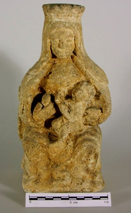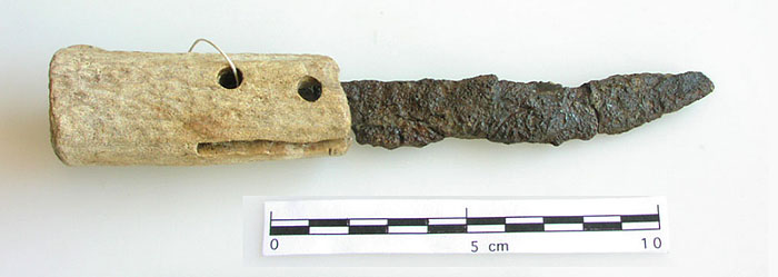 Aquests vestigis es troben sota i al voltant del casal actual. El castell seria la continuïtat de l'antiga casa senyorial del lloc, convertida en castell o centre d'un terme, malgrat que no posseeix cap element material de defensa. Els baixos i murs tenen estructures medievals, però la imatge que avui en resta no en té cap aparença. Convertit en un mas des de fa segles, i en residència privada en l'actualitat, no hi ha indicis de cap important fortificació. De l'estructura principal, reformada al segle XVIII per a assolir la tipologia de masia, amb tres cossos i una sala central al pis, poden restar-ne elements encara del vell castell. Així, a la planta baixa hi ha un conjunt d'arcuacions que haurien estat un pati central amb escala al fons. La datació és imprecisa. ![]() Ganivet de ferro amb mànec de banya. Segle II aC. Sitja del poblat ibèric de Mas Castell. Museu Arqueològic de Banyoles - (Ampliar)