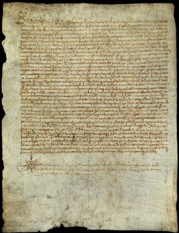 Fundada el 1182, l'església de Sant Andreu és un exemplar d'edifici romànic del segle XII. El 1364 va ser venuda per la reina Elionor a Ponç de Canadal, abat de Banyoles. L'any 1795 va ser saquejada pels francesos. Al seu interior es conserva una interessant creu processional. ![]() 1450-1459. Donació atorgada per Bernat Mir, de Serinyà, senyor útil del mas Mir de l’esmentada parròquia, a favor de Joan, el seu fill. Fons Ajuntament de Girona - (Ampliar) Està construïda amb carreus escairats. Mostra algunes capelles obertes al gruix del mur de factura posterior. Destaca la senzillesa de la seva decoració. La façana principal presenta, sobre la portalada amb arquivoltes en gradació i una finestra similar, una cornisa de pedra motllurada que descansa sobre cartel·les de pedra. La cornisa de pedra segueix a mitjana alçada al llarg de les façanes laterals, degut a una ampliació en alçada posterior. L'absis presenta, a la part superior, arcuacions llombardes i un fris en serra sota la cornisa motllurada. La torre-campanar, de construcció posterior, s'alça sobre la façana principal i és de planta quadrada amb coberta a quatre vessants. ![]() Pallissa de Can Serbosa. 1890-1916. Autor desconegut. Arxiu Fotogràfic Centre Excursionista de Catalunya - (Ampliar)