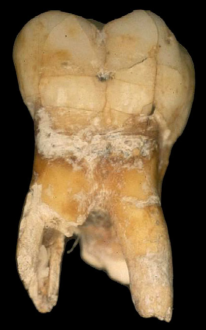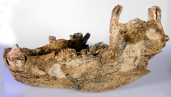 Durant el Paleolític Mitjà van ser habitades primerament pels preneandertals (Homo heidelbergensis), fa uns 200.000 anys, i posteriorment pels seus successors, els neandertals, com a mínim entre fa 90.000 i 39.000 anys. Tant uns com altres eren caçadors-recol·lectors nòmades que s'havien de desplaçar constantment per buscar aliments. ![]() Mandíbula d'ós de les cavernes (Ursus spelaeus). Cova de l'Arbreda. Museu d'Arqueologia de Banyoles - (Ampliar)