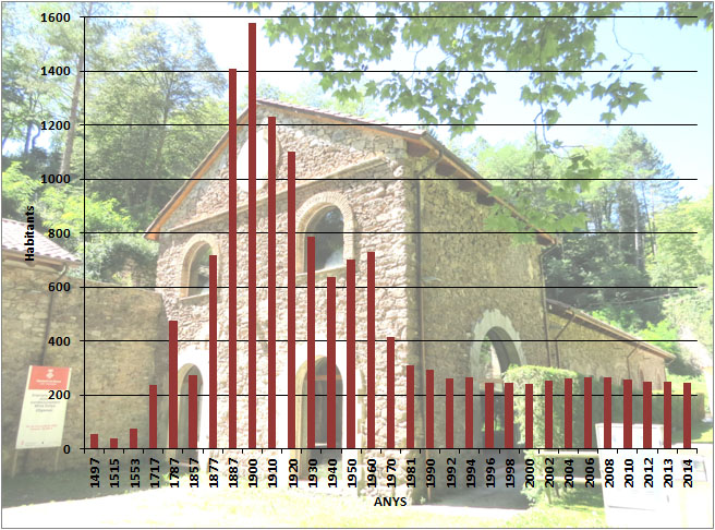 De tot el regitzell de fonts que donen cos al municipi d'Ogassa cal destacar la font del Miner, situada a l'avinguda de les mines; la font Gran, a la qual s'accedeix per un camí que sortint des del Taller voreja la riera, la font del Freixe que proveeix d'aigua la població, i la de la Nina, situada a la cruïlla de l'avinguda de les Mines amb la plaça Dolça, que recorda que Ogassa, l'any 1987 va rebre la distinció de població primera classificada del guardó "Vila en flor de Catalunya". ![]() Evolució demogràfica d'Ogassa. - (Ampliar) Bibliografia