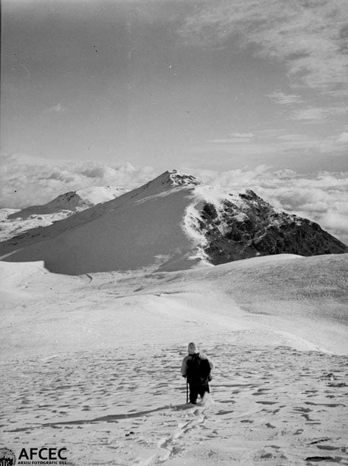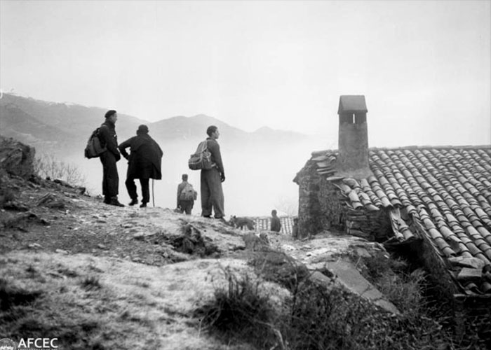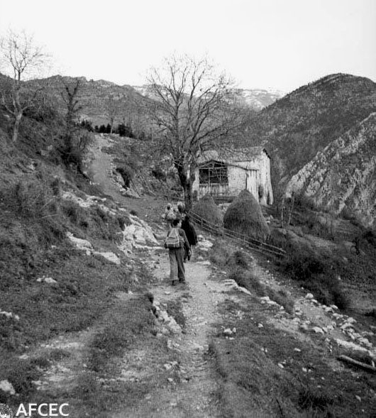 Excursionistes arribant a la Masia de Vilabona a Ogassa. 1939-1955. Antoni Maymó Duarte. Arxiu Fotogràfic Centre Excursionista de Catalunya - (Ampliar)