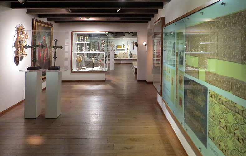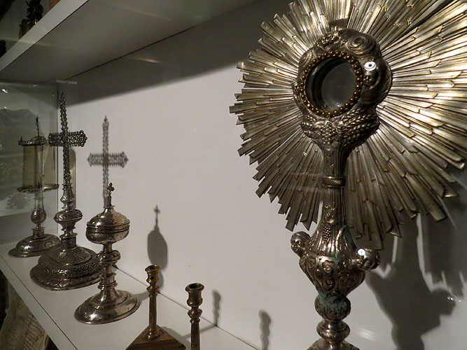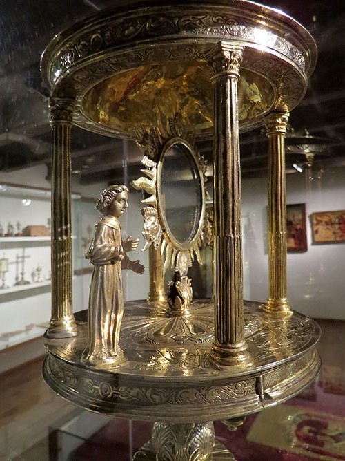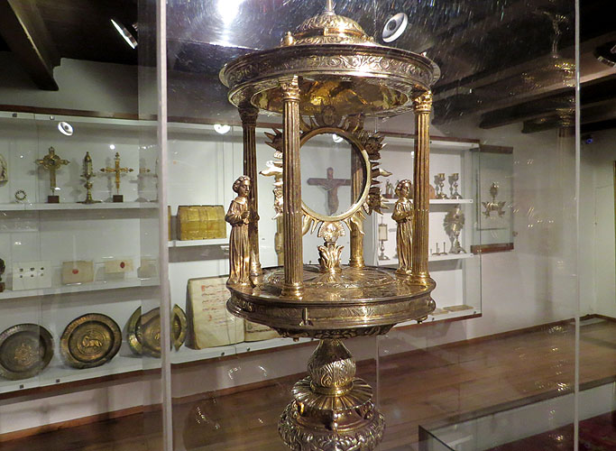 Sala del Museu de Sant Joan de les Abadesses. En primer terme custodia del Corpus Christi. Obra de l'orfebre barceloní Pere Farell, 1584. Argent daurat. Àngels del segle XIV