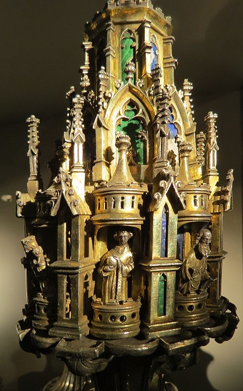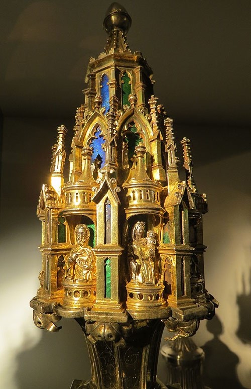 Custodia del Corpus Christi. Obra de l'orfebre barceloní Pere Farell, 1584. Argent daurat. Àngels del segle XIV