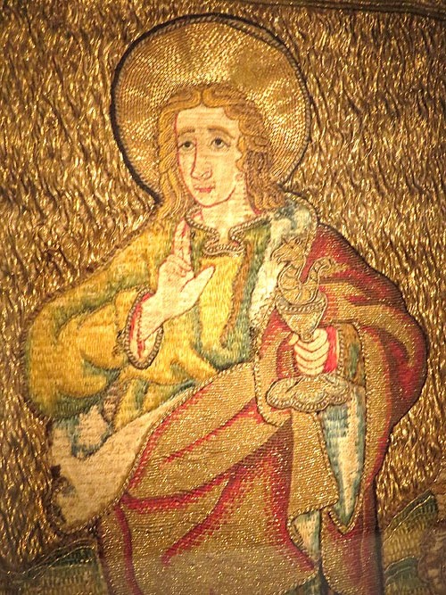 Capa pluvial amb la imatge de Sant Joan Evangelista. Detall. Vellut i seda, brodat. Segle XVI - (Ampliar)