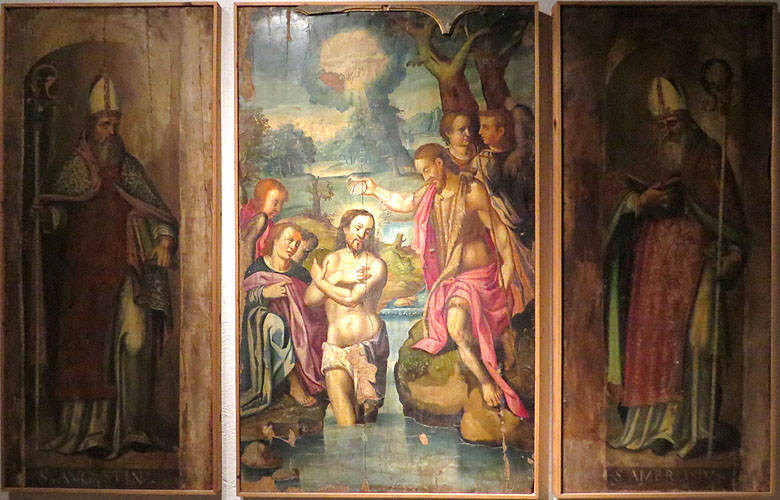 Pintures del retaule major del monestir. Sant Agustí, el baptisme de Jesús i Sant Ambròs. Probablement vinculades al taller del pintor Antoni Peitaví. Tremps sobre fusta. Segle XVI