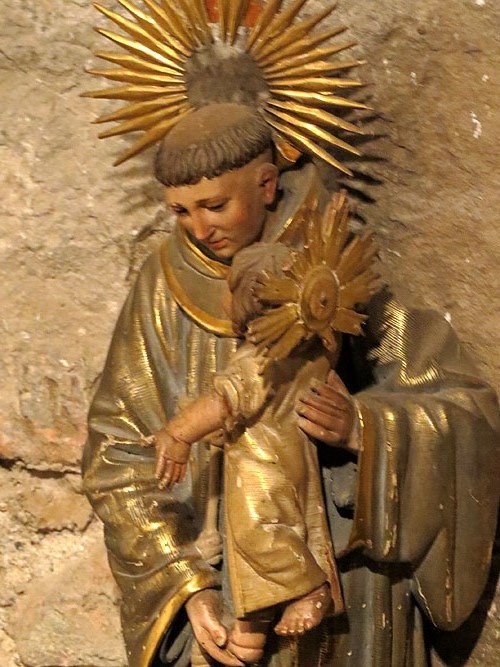 Imatge de Sant Antoni de Pàdua. Fusta tallada i policromada. Prové de l'antiga capella de Ca l'Isalguer. Segle XVIII