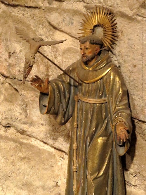 Imatge de Sant Francesc d'Assís rebent els estigmes. Fusta tallada i policromada. Prové de l'antiga capella de Ca l'Isalguer. Segle XVIII
