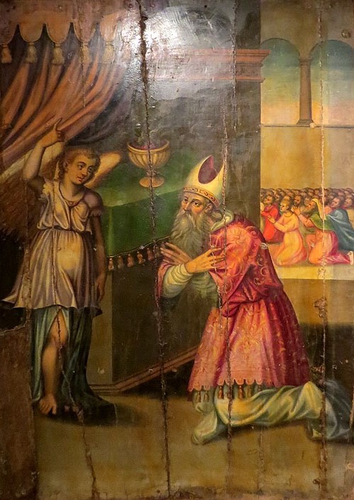 Pintura del retaule major del monestir. Aparició de l'Àngel a Zacaries. Probablement vinculada al taller del pintor Antoni Peitaví. Tremp sobre fusta. Segle XVI
