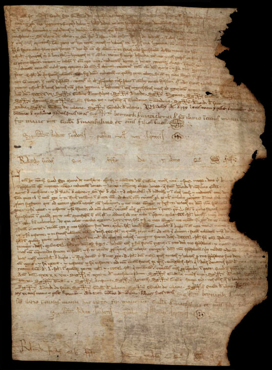 El 1191, el comte-rei Alfons I el Cast va fer estada en el castell de Montsoriu. En aquesta època, a més dels vescomtes, en el castell hi vivien una família de castlans, de rang inferior als vescomtes que eren qui s'encarregaven de la guarda i defensa del castell. El càrrec de castlà el nomenava el senyor del castell, i li podia confiar el castell de forma temporal o permanentment. El domini útil del castell sempre se'l reservava el senyor. ![]() 22 de maig 1368. Carta del rei Pere convocant l'host i cavalcada a Tortosa per anar al castell de Montsoriu per treure-hi uns foragitats de pau i treva. Arxiu Comarcal del Baix Ebre - (Ampliar)