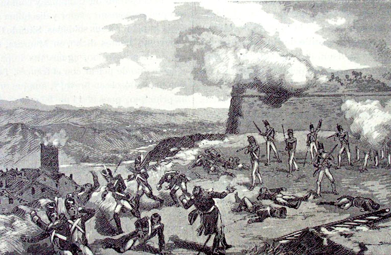 Capitulada Girona l'11 de desembre de 1809, s’inicià el bloqueig formal del castell que va començar el 13 de gener de 1810, quan les tropes franceses van ocupar la veïna població de Massanes. El dia 14 del mateix mes, els francesos van avançar fins prop del castell. Malgrat el foc que van fer des del castell i la Torre dels Frares, els francesos van prendre la vila. El dia 20 va començar una pluja de metralla i bombes sobre el castell, que va continuar l’endemà. Van caure més de 3.000 bombes sobre el castell, però el coronel Estrada no defallia. ![]() Setge del castell d'Hostalric durant la Guerra del Francès. Il·lustració de Josep Serra i Pausas a "Glorias españolas", datat entre 1888 i 1892. CRDI, Ajuntament de Girona - (Ampliar)