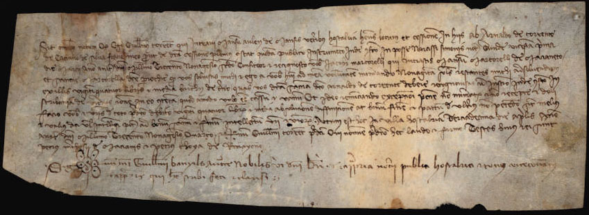 En època romana passava per aquest indret una bifurcació interior de la Via Augusta (1). Es van trobar restes d'aquesta via quan es va construir la carretera de Sant Hilari Sacalm. Als Vasos Apol·linars s'esmenta la mansió de Seterrae, que, segons l'itinerari es trobava a unes 15 milles (22 kms) respecte a Aquae Voconiae (tradicionalment identifict amb Caldes de Malavella) (2). ![]() Àpoca datada el 13 d'abril de 1394 a Hostalric. Guillem Torrent, del mas Aulen d'Hostalric, firma rebut a Jaume Martorell, del mas Martorell de Maçanet, i a Sança Martorell, dels 90 sous que faltaven per acabar de pagar un deute de 24 lliures i mitja. Biblioteca de Catalunya. - (Ampliar)