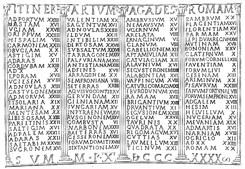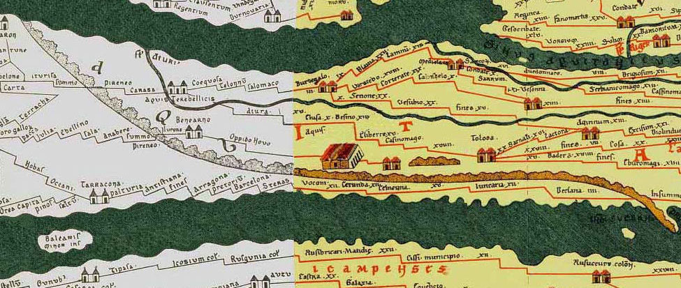 La situació, estratègica d'Hostalric va fer que a l'antiguitat fós zona de pas obligatori en la ruta nord-sud, i l'únic accés natural entre Girona i Barcelona. La configuració geogràfica de la vila és l'habitual dels poblats ibèrics; situats damunt d’un turó enlairat, prop d’un riu, i de fàcil defensa. ![]() La Taula Peutinger. Fragment des de Tarragona a La Jonquera. Viquipèdia. Aquest document és una còpia que va fer un monjo de Colmar el segle XIII d'un document original, avui dia perdut, de temps de l'Imperi romà entre els segles I i III. - (Ampliar)