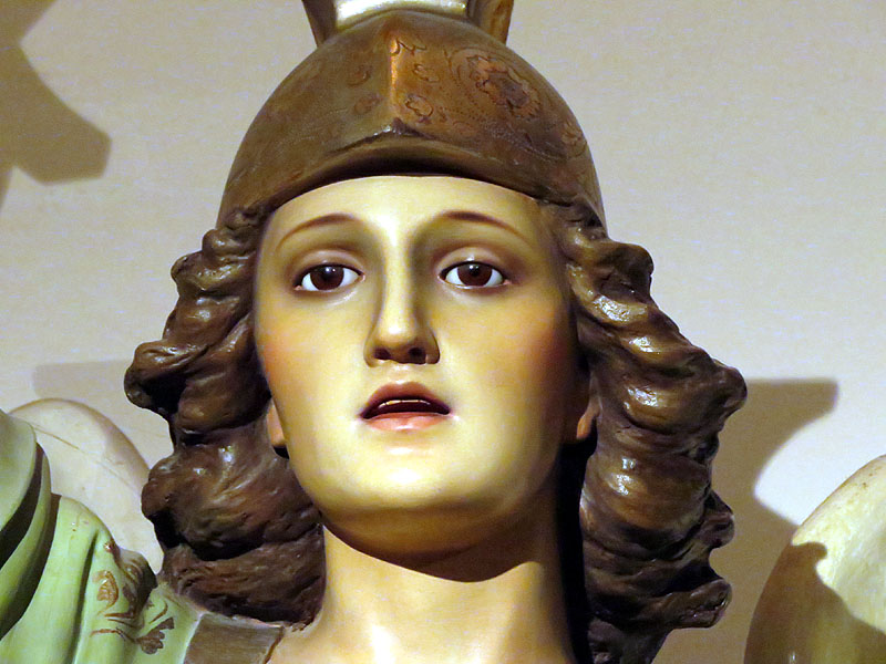 Riudellots de la Selva. L'església de Sant Esteve. La primera església romànica. L'esment més antic conegut de Riudellots és en una acta de donació datada el 24 de novembre de 882, on el bisbe Teuter dóna als canonges de la Seu els delmes de la basilicam de Rivo de Luto a Santa Maria de Girona i a Sant Feliu. Als anys 1028-1041 s’esmenta per primera vegada la parròquia de Sant Esteve de Riudellots. Les notícies de l’església de Riudellots, dels segles IX fins al XV, es refereixen a un edifici que ja no existeix. Segurament es tractava d’una església romànica que s’utilitzà fins cap a l’any 1430, moment en el que es va canviar l'emplaçament del poble (1) i es va construir a la ubicació actual de l’església una capella dedicada a Sant Sebastià, sota el que més tard seria el campanar de la nova església.a (2). ![]() Detall de la imatge de Sant Miquel - (Ampliar) L'actual església gòtica.