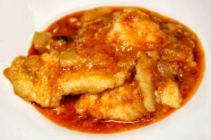 Posar un bon raig d'oli d'oliva en una cassola de fang prèviament escalfada, a foc lent. Quan sigui calenta ja es pot donar-li més foc; el fang no vol canvis bruscos de temperatura. Utilitzar uns trossos grans de rap, que no té gens d'espines, així com els lloms de la lluerna i de l'escórpora que ha servit per al brou; aquest plat sempre es fa amb peix sense espines. Salar el peix i enfarinar-lo. Fregir-lo per segellar-lo, i reservar.