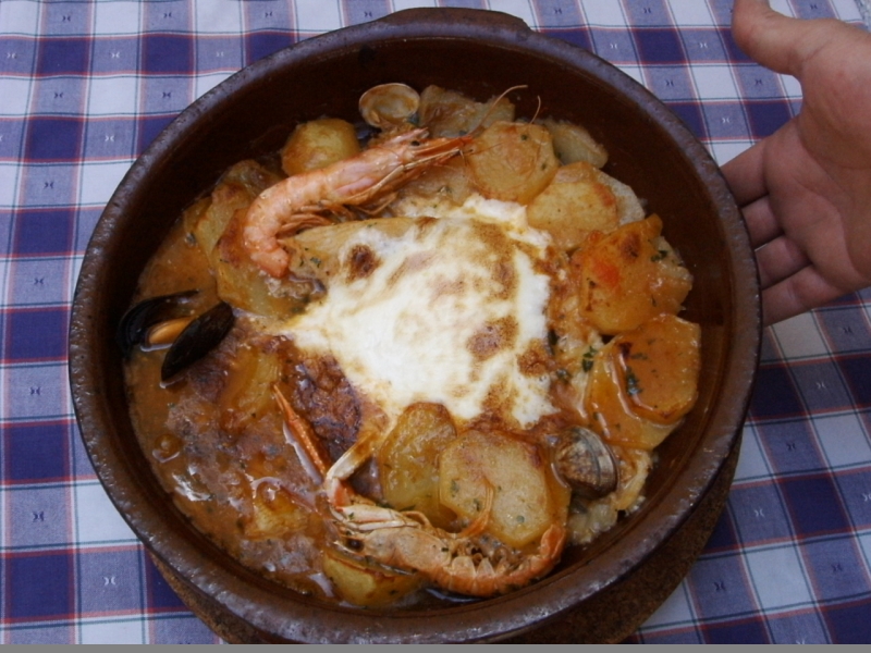 L'origen del plat. El plat, profundament arrelat a la tradició marinera de Tossa, procedeix de quan els pescadors sortien a la vela o a rem, i es veien obligats a passar moltes hores fora de casa. Per tant, s’emportaven a la barca un fogó, carbó, un morter, una olla de ferro, un cistell amb patates, cebes, alls, tomàquets i pebrots, i també oli i espècies: sal, pebre, safrà, etc., per poder fer-se el dinar.