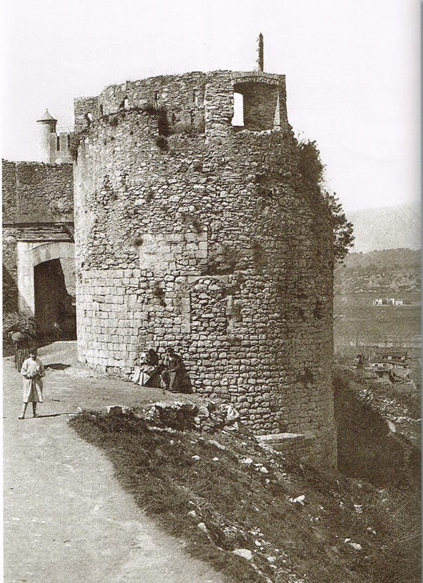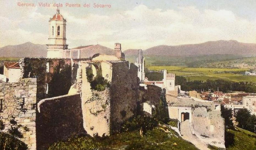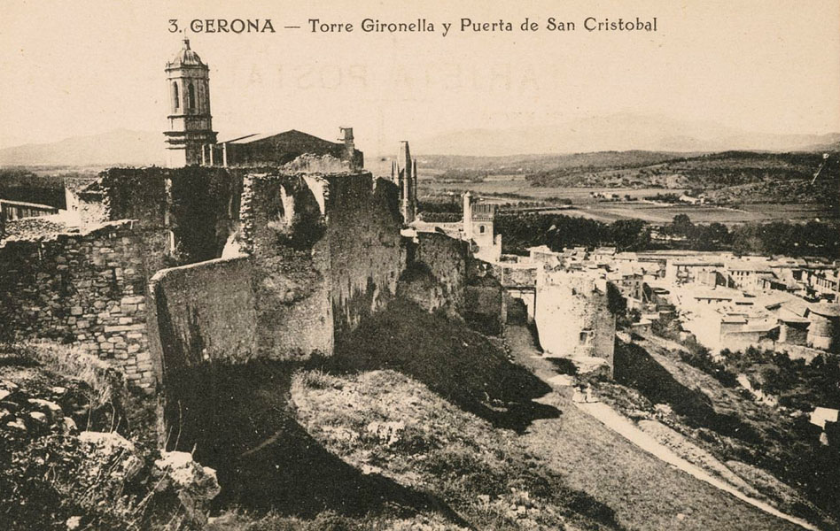 (Ampliar) - Vista de la Torre Gironella. A la dreta, la Torre Magdala. Autor Fargnoli. Fons Ajuntament de Girona.Les llegendes