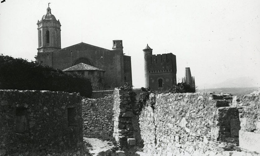 (Ampliar) - La Torre Magdala entre la Catedral i el campanar de Sant Feliu. Sense data. Autor: Salvador Crescenti Miró. Col·lecció Ajuntament de Girona.L'edificació