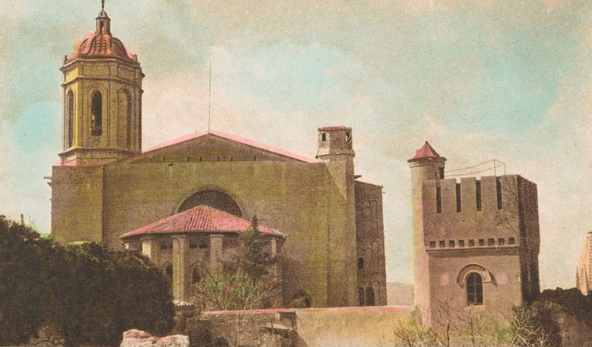 (Ampliar) - Postal antiga acolorida. S'hi observa la Torre Magdala a la dreta del campanar de Sant Feliu. Col·lecció particular, Girona.