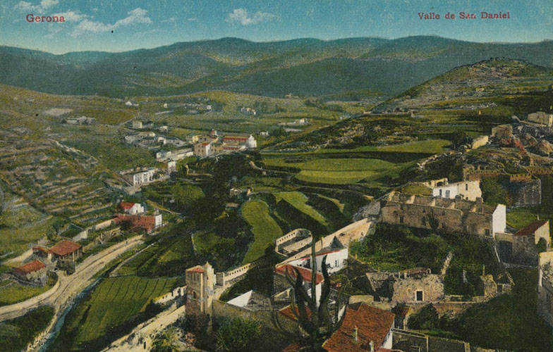(Ampliar) - Vista de la Vall de Sant Daniel. A la part inferior s'observa la Torre Magdala. Postal antiga acolorida. Autor desconegut. Col·lecció Ajuntament de Girona.