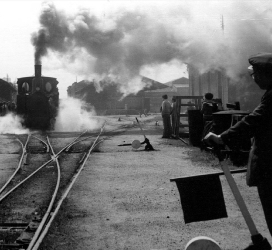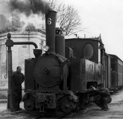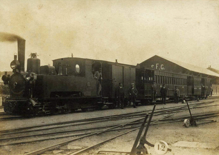 El primer viatge comercial, que va iniciar el servei regular, va ser el 30 de juny de 1892 a les 05:01 del matí. ![]() (Ampliar) - Locomotora n. 4, model A6 al costat del moll de càrrega de carbó. Al darrere, apareix la Torre de les Eres. Imatge: Arxiu Municipal de Sant Feliu de Guíxols