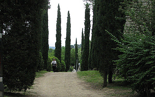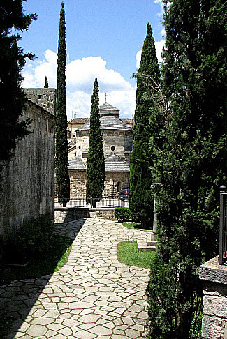 Grup de xiprers davant Sant Pere de Galligants amb Sant Nicolau, al fons.